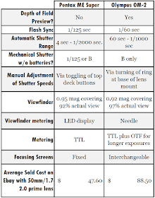 While it has become apparent that I have a bit more affection for the ME Super than the OM-2, I actually wouldn't automatically recommend it over the Olympus, given the variances in features that will vary among user preferences. Both models offer a wonderful range of features, usage, and optics that is sure to please the shooter looking for a compact, well-featured, and intuitive model. In fact, my only recommendation would be that if you can manage it, snap up both cameras, even if one sees more use than the other. And rest assured that you won't really know which that will be until you've tried both!